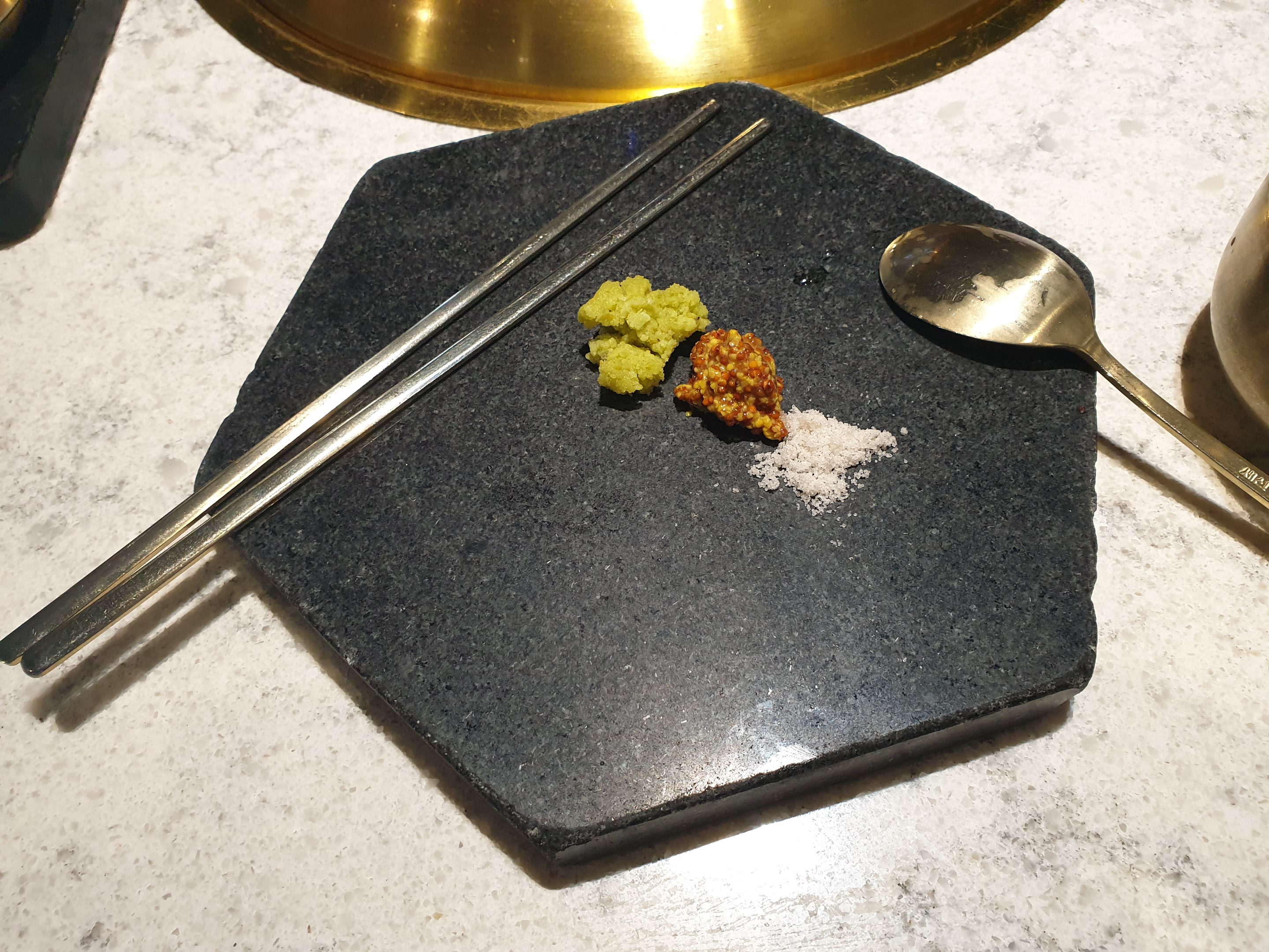 해골의 뇌를 열면 와사비와 소금 홀그레인 소스가 있습니다.