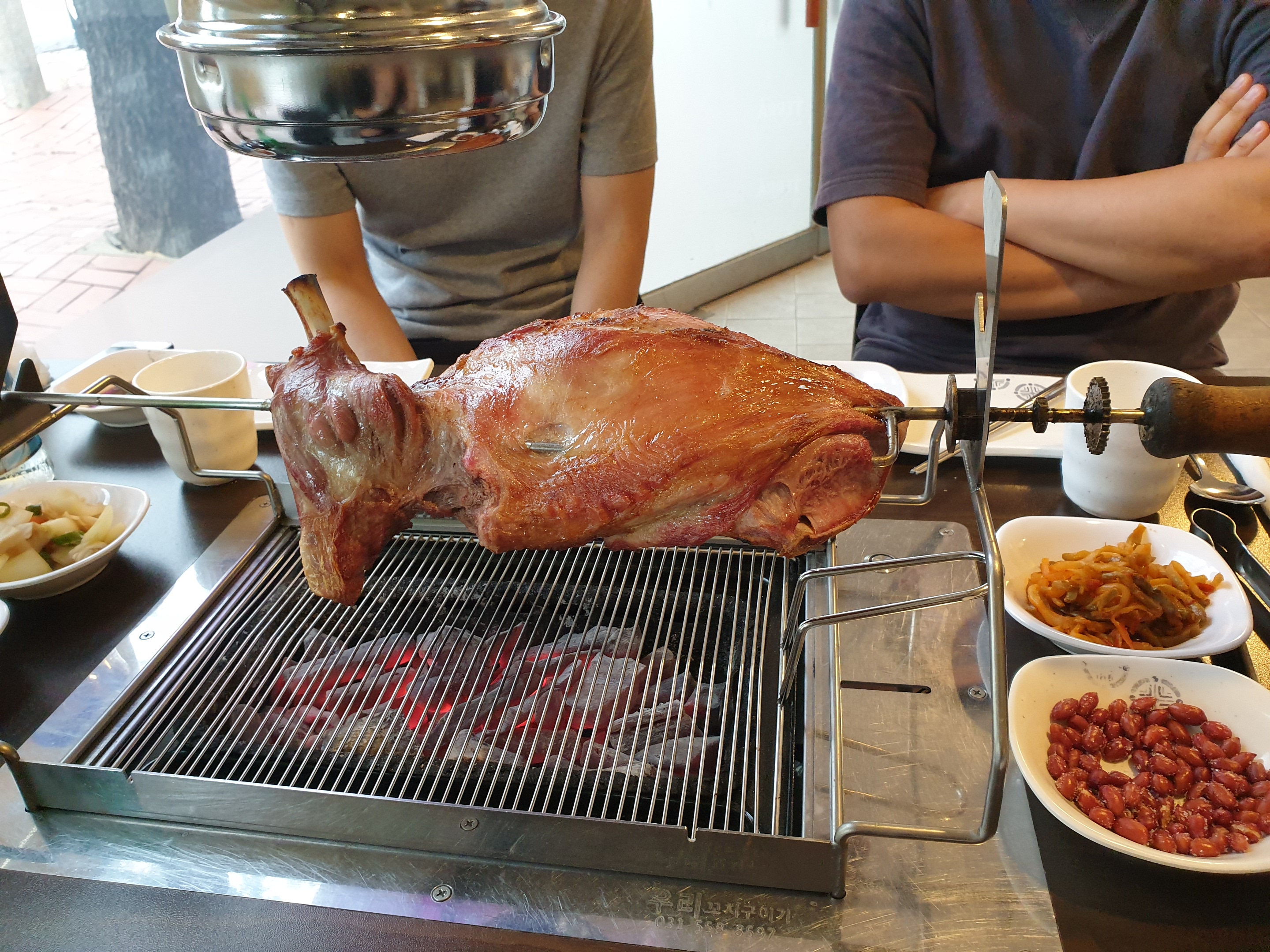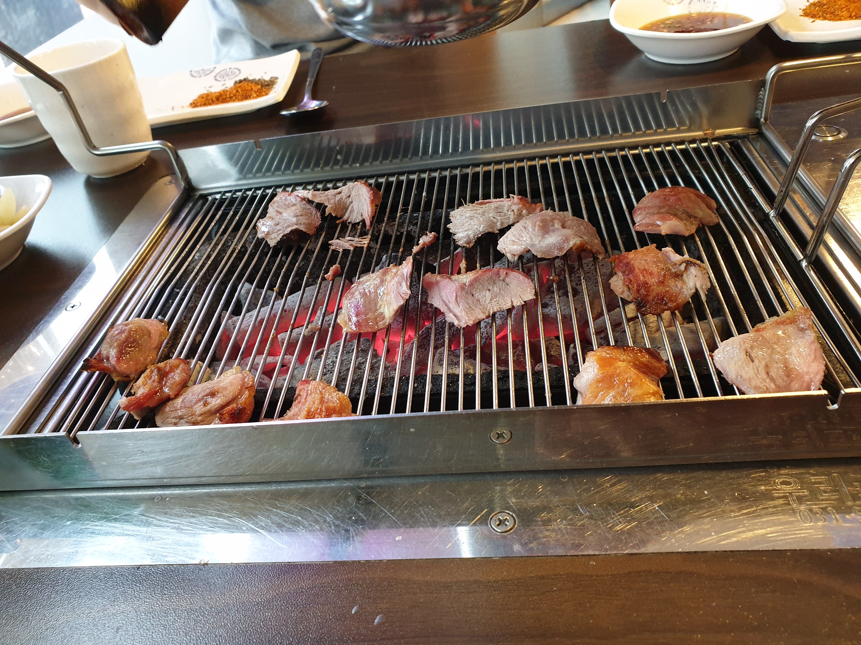 위에서 칼로 잘라서 아래의 화로에서 굽는 듀얼 구이입니다.